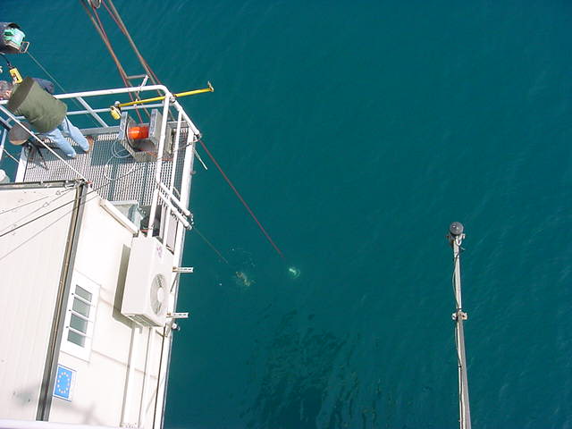 Tuesday, April 3, 2001 Another instrument that goes all the way to the bottom. This one measures water temperature, as a function of depth. |