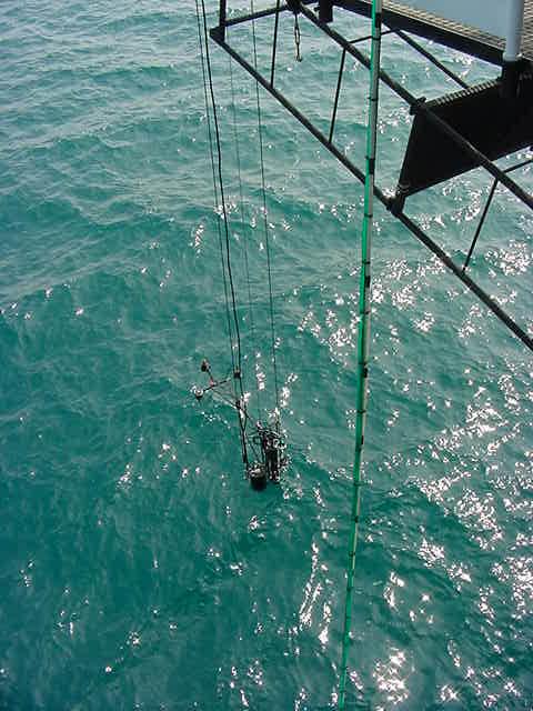 Tuesday, April 3, 2001 Two instruments suspended below the water. On the right, the green instrument measures the water conductivity & salinity; it moves up & down to measure a profile of salinty as a function of depth. On the left, a water sampler returns a cannister of water from the desired depth, which is chemically tested in the shed. To the right of the picture a radiometer on a boom monitors water surface radiance. |