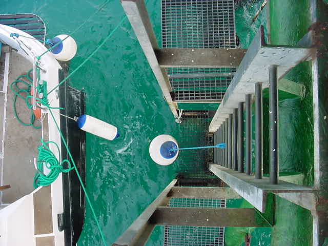Wednesday, April 4, 2001 To get on the platform, you jump from the boat to the catwalk (top or bottom of the picture), then swing around to the ladder and climb up. Equipment is hauled up with a winch. In rough water it can be an adventure, but we had pretty easy water most of the time. |