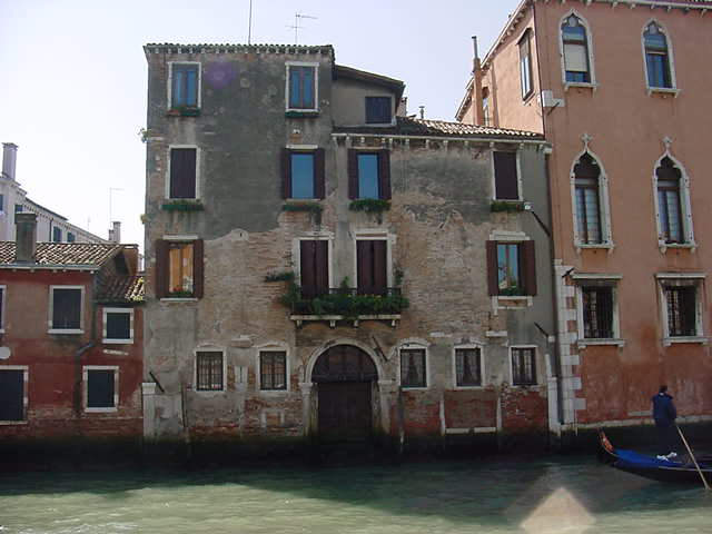 Sunday, April 1, 2001; about noon Several of the buildings along the Grand Canal show obvious signs of having been modified somewhere along the way. Here you can see along the bottom of the building that the old arched windows were filled in and replaced with smaller windows, along with other signs of old features being replaced. |