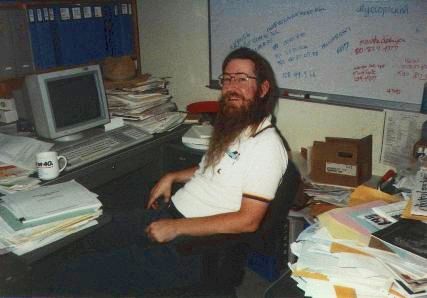 This picture was taken about 1991, in my old Radio Astronomy Group office. My new office is about equally well organized, as is typical for me. Click on the image to get a higher resolution (62kb) version. I bought the shirt in Hawaii in 1987. It has a little rainbow colored "wave" over the pocket (facing the camera). Originally, it also had "Hawaii" written under the wave, but "Hawaii" disappeared altogether the first time I washed the shirt; it was, as it turns out, only "glued on", as if somebody used the same technique used for writing on a cake with frosting!