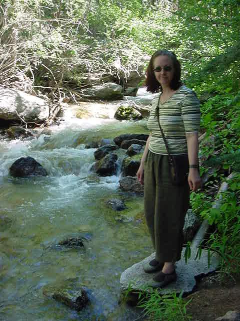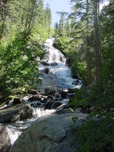 A waterfall featured in the first picture feeds a stream that flows along the park & campground. That stream, and Pam Gonzales are featured in the second picture. The road in stretches across Owens Valley from Lone Pine, climbs the eastern slope of the Sierra, and then reaches up a canyon with walls both steep & high, to reach the portal. The high walls are featured in the third picture.