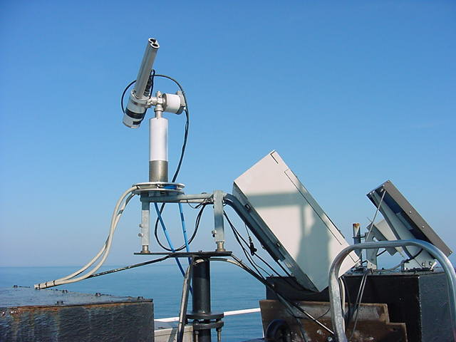 Monday, April 2 2001 This is the CIMEL. The box at right center is the power supply & controller; solar power collector is the flat black plate at the far right. The double-barrell business end of the radiometer is pointig up at the sun. The radiometer tracks the sun, and periodically scans the sky in a full range of azimuth & elevation. The difference in brightness as a function of angle from the sun allows for a determination of aerosol (particle) size distribution & opacity. |