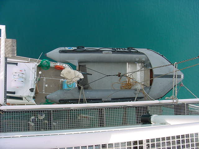 Tuesday, April 3, 2001 Sometimes the water is not so easy. In rough water, the crew evacuates by getting into this grey rubber boat, lowering into the water, and motoring over to the larger boat. On at least one occasion the water was to rough even for that, and in the end crew members had to swim from the rubber boat to the larger boat. |