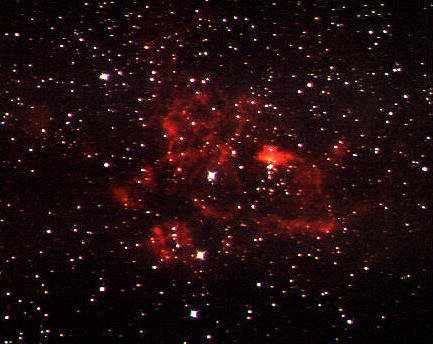 The open cluster Pismis 24 is located inside the emission nebula NGC 6357. The nebula is diffuse enough not to show up on the Palomar sky survey image in figure 1, but we can see it in figure 2, which is 30x30 arcminutes, whereas figure 1 is 15x15 arcminutes (this picture comes from the astronomical images of Steve Quirk's Frog Rock Observatory). The cluster Pismis 24 is seen in this image, immediately below the brightest red knot of the emission nebula, right of center, asuming I have my berings straight. Massey et al. derive a distance modulus 12.03±0.14 mag using all of the cluster stars, and 11.99±0.05 using only the 6 O-class stars, so they adopt a true distance modulus of 12.0 mag, or 2.5 kpc (8150 ly). That's rather farther than earlier estimates around 1.7 kpc (5500 ly). The cluster is small & relatively unstudied.