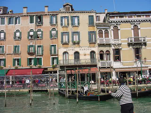 Sunday, April 1, 2001; 11:40 AM Here is the Hotel Marconi, right on the Grand Canal. The Rialto Bridge is a turn of the head to the right, just out of the picture. The hotel staff all spoke English quite well. The rooms were small, but so is everything else in Venice. The hotel seemed to cater to quite a few foreign visitors, and was about the only place to find a non-Italian breakfast. Only two of the canal-view windows are hotel rooms, the rest are private apartments. |